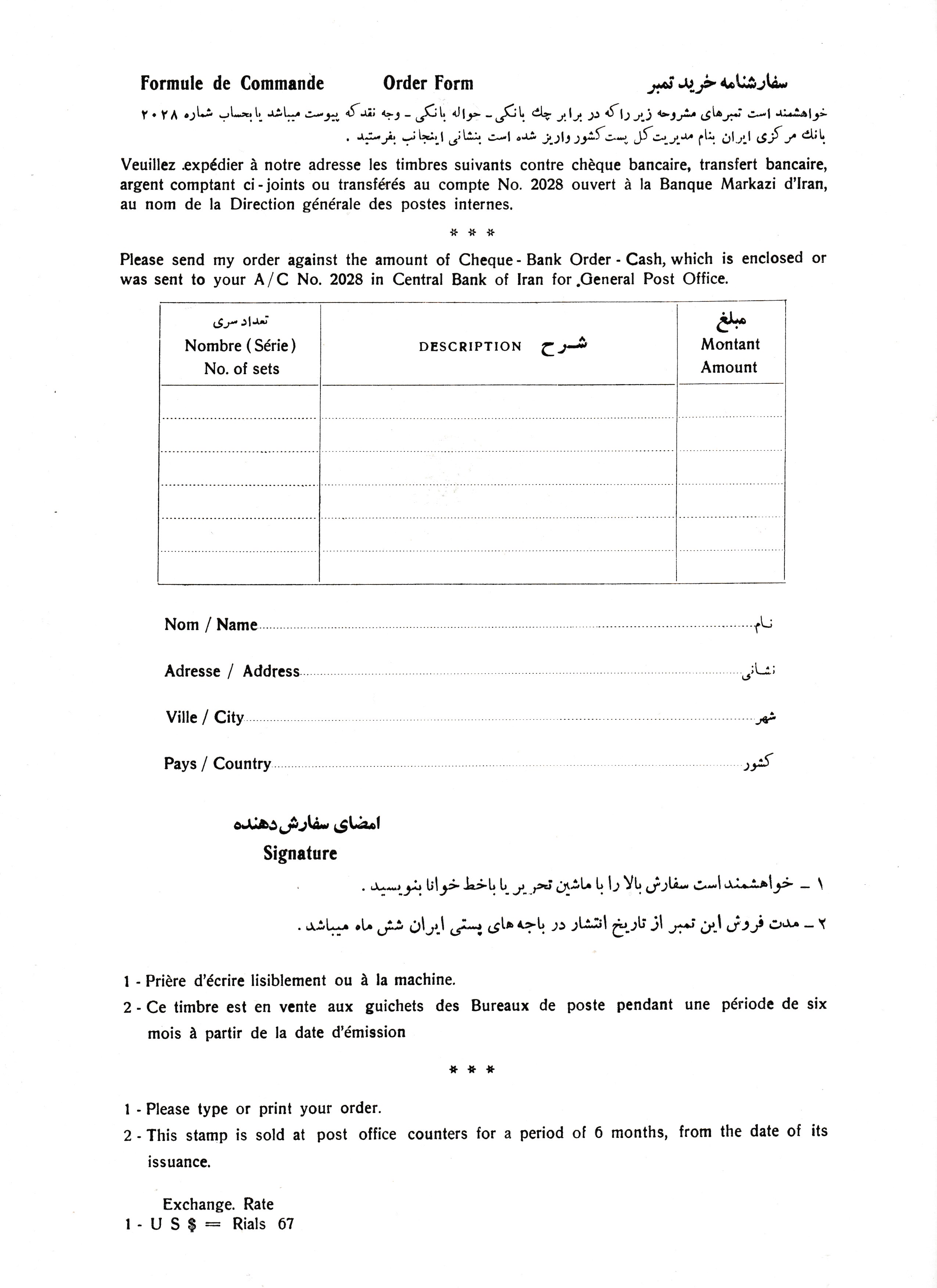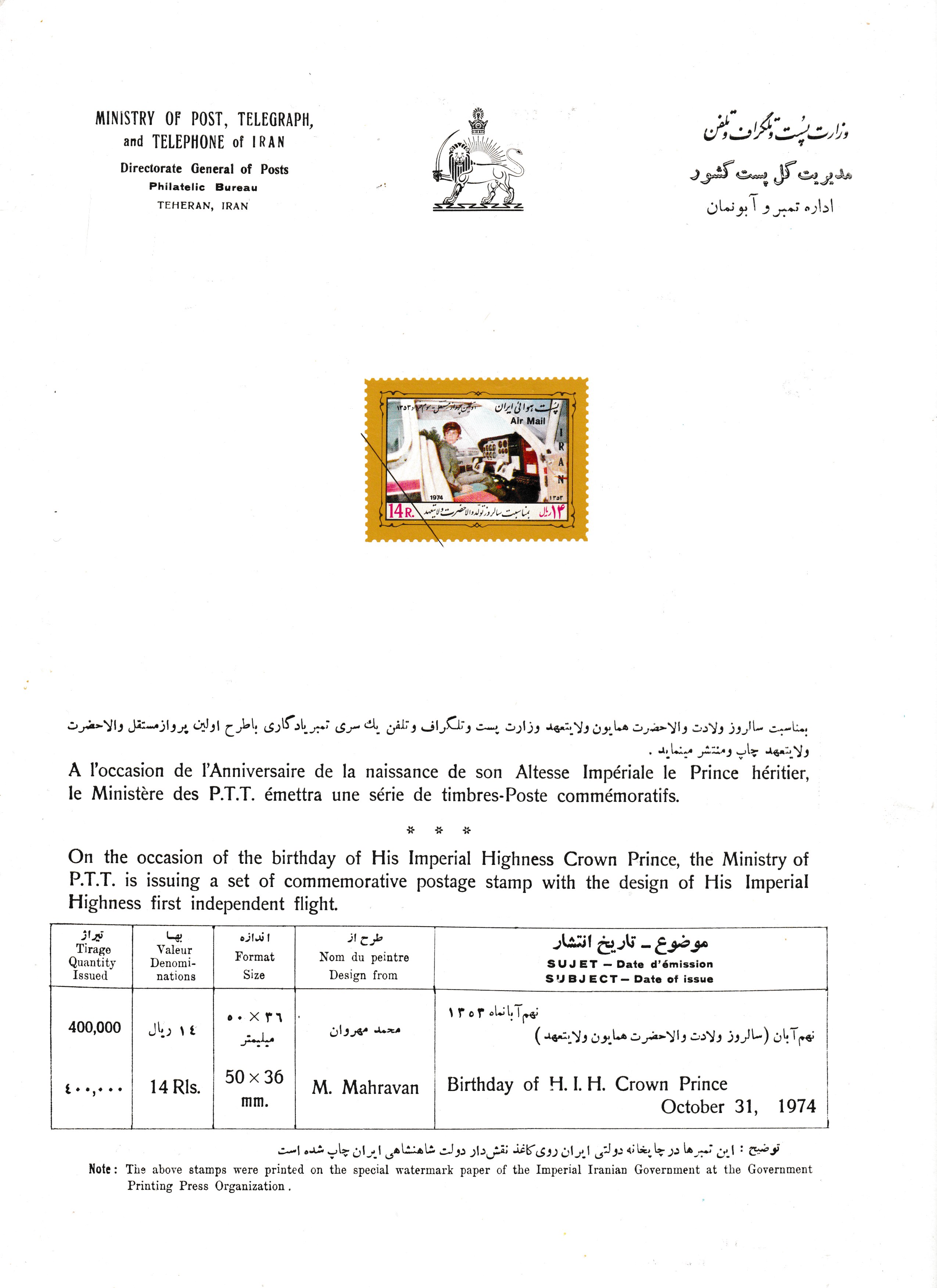 Bestellschein für Versandstelle in Teheran, Herausgegeben am 31.10.1974, Michel Nr.1759, anläslich der Geburtstag des Kronprinzen