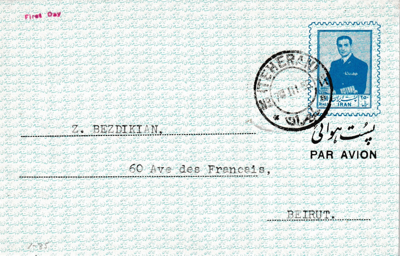| 1956 Aerogramme, 2,5 Rial blau auf weißem Papier, Ersteausgabetag 7.3.1956 Doppelkreisstempel bilingualdoppelkreisstempel von TEHERAN nach Beirut