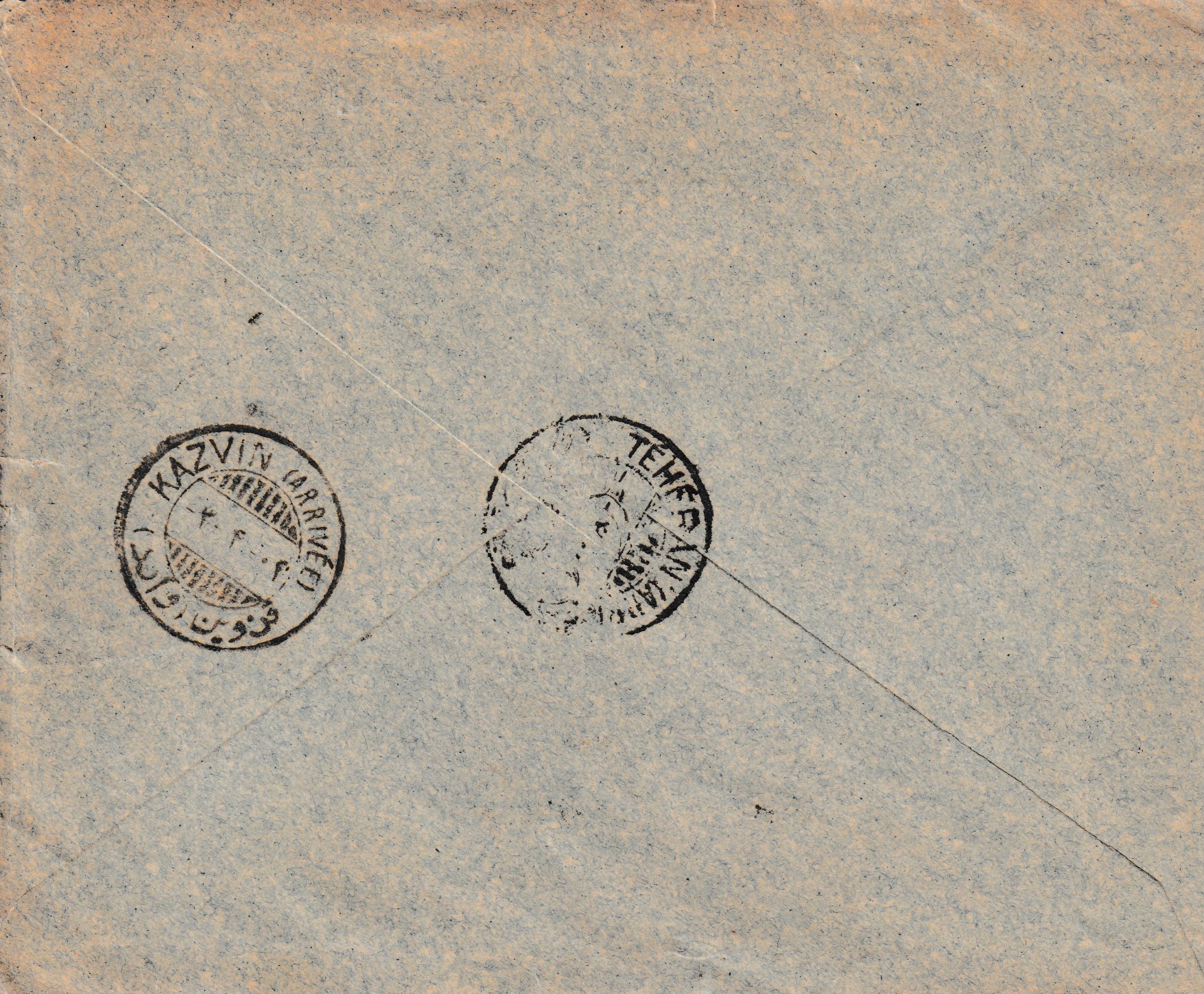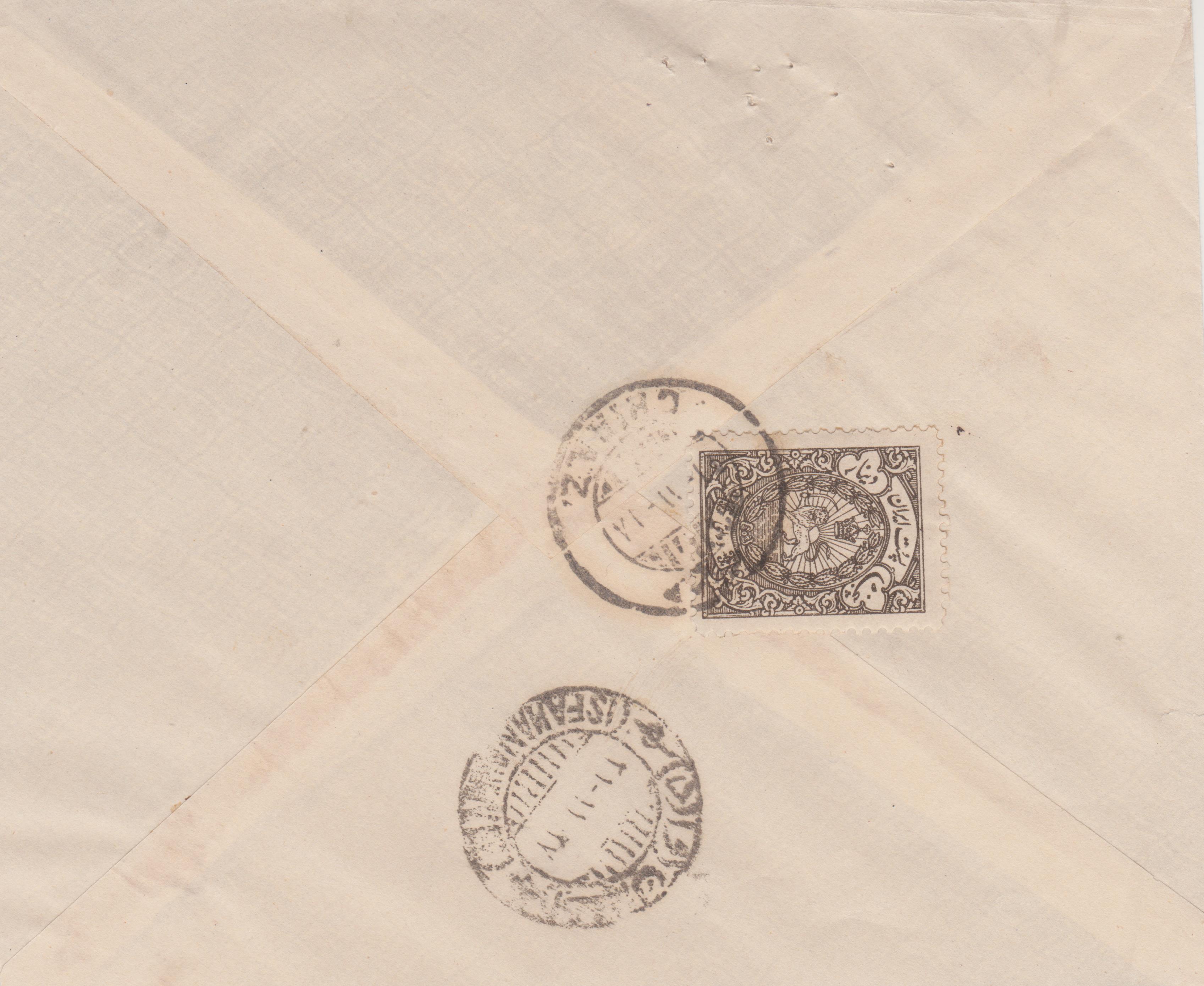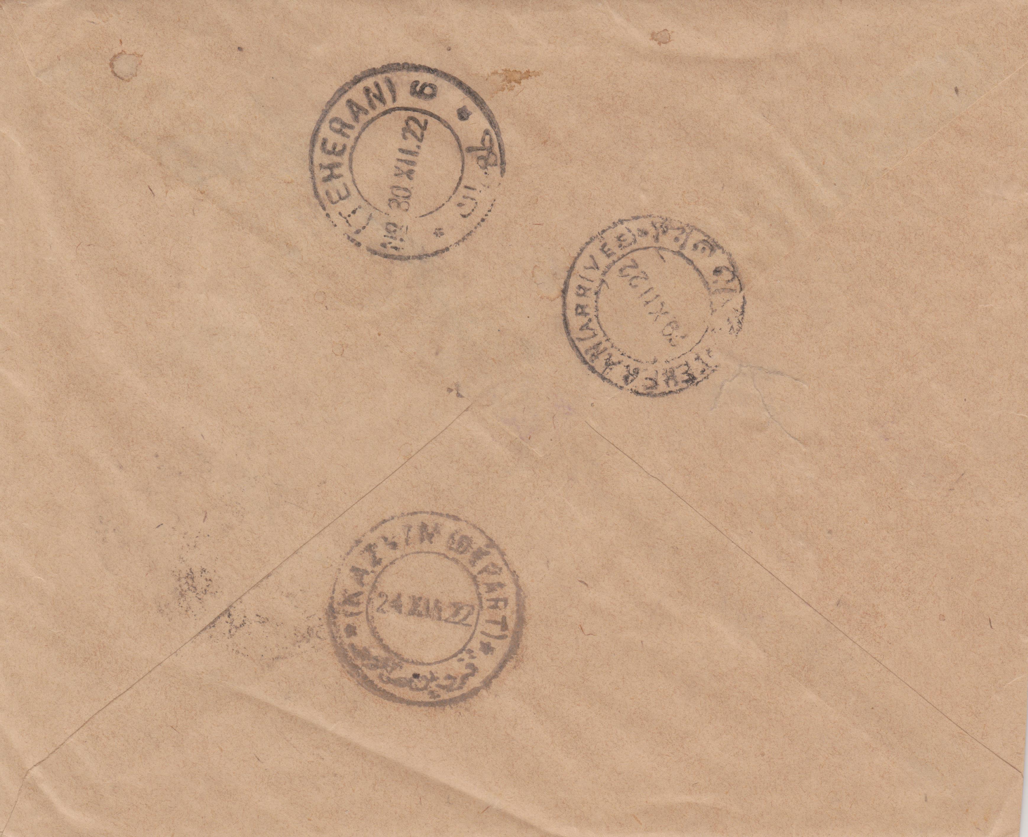 Privater Inlandbrief von Kazvin über Teheran nach Yezd. Auf der Rückseite Aufgabestempel Kazvin 24.XII.22, Ankunftsstempel Yezd 16.I.23