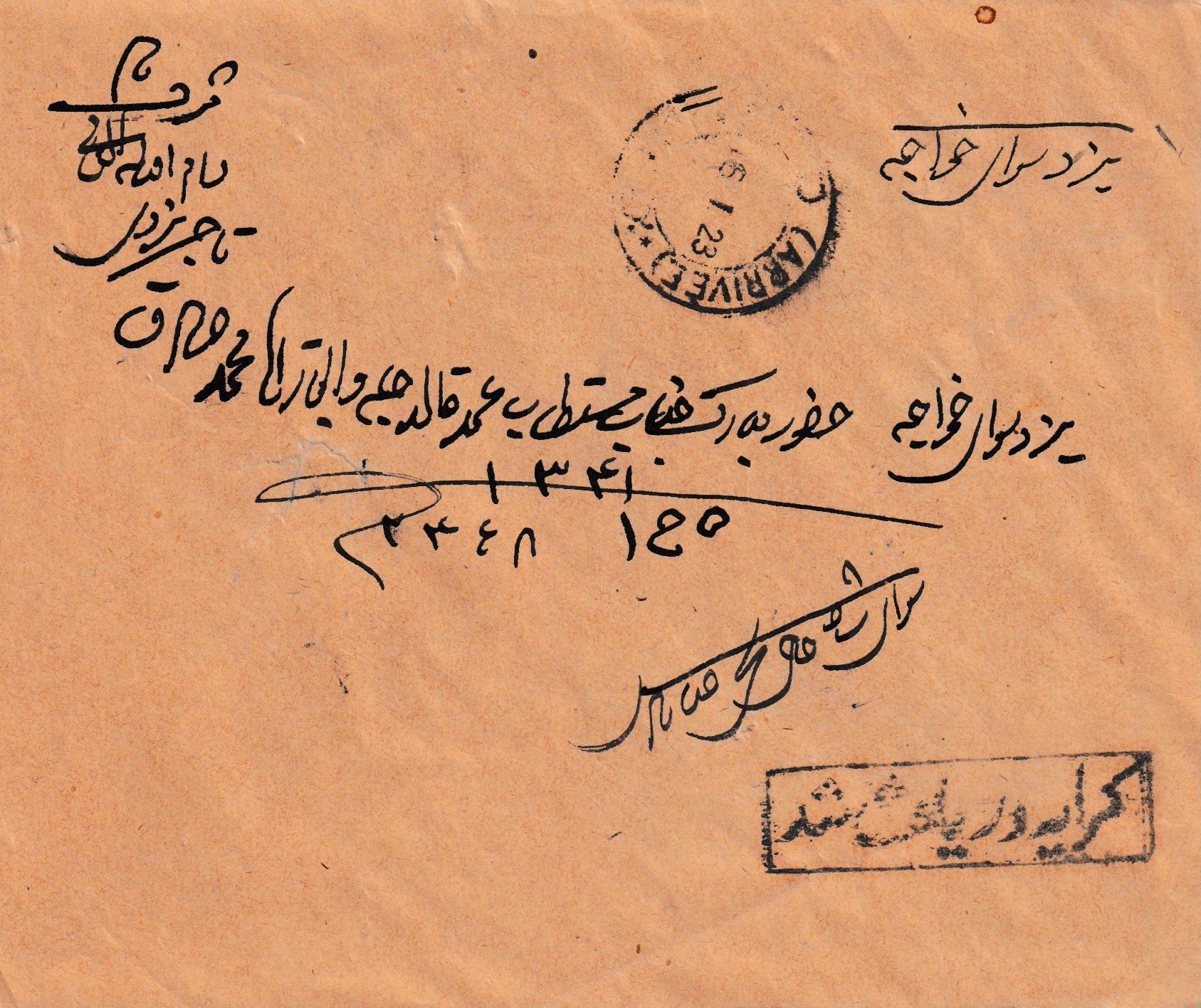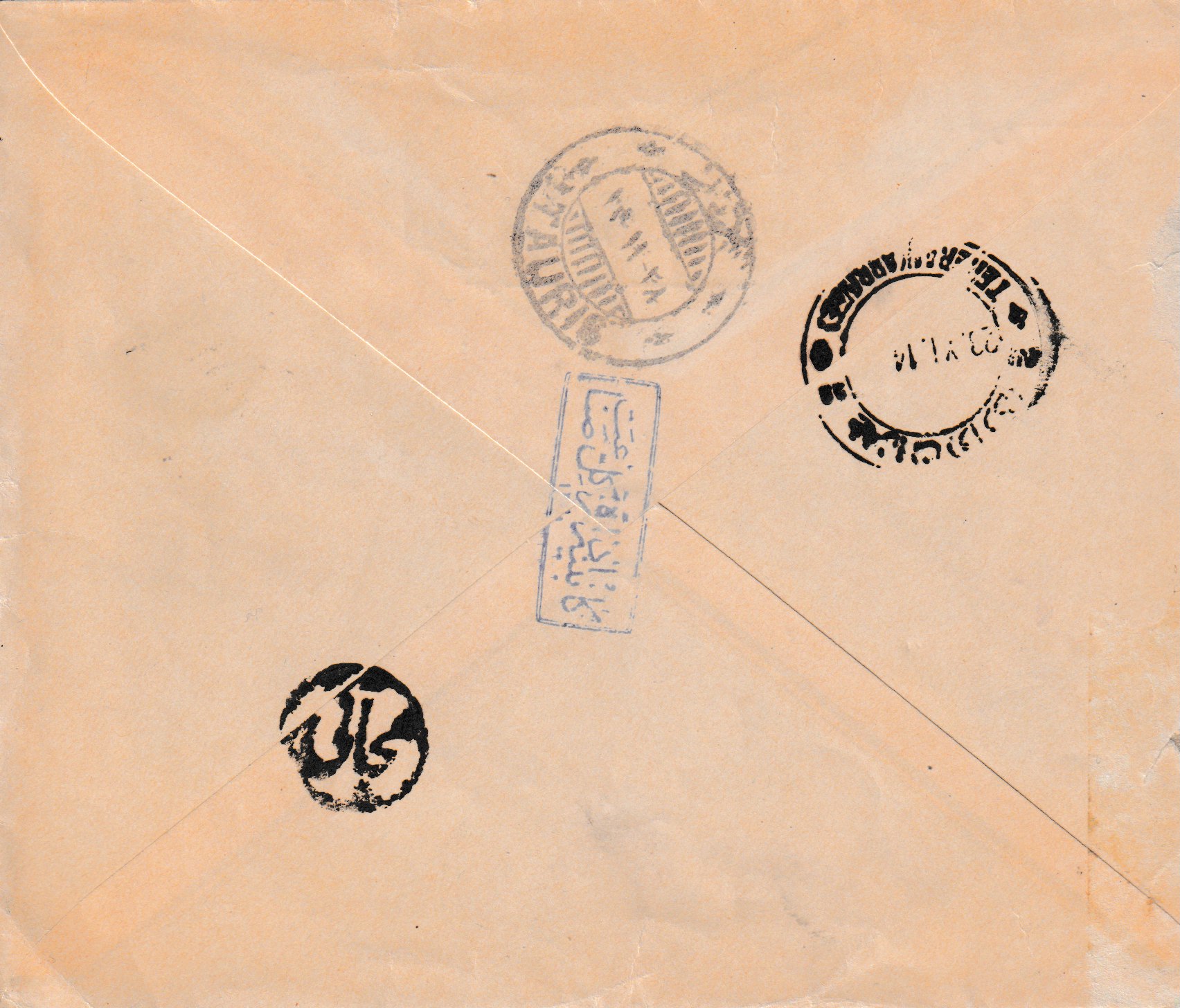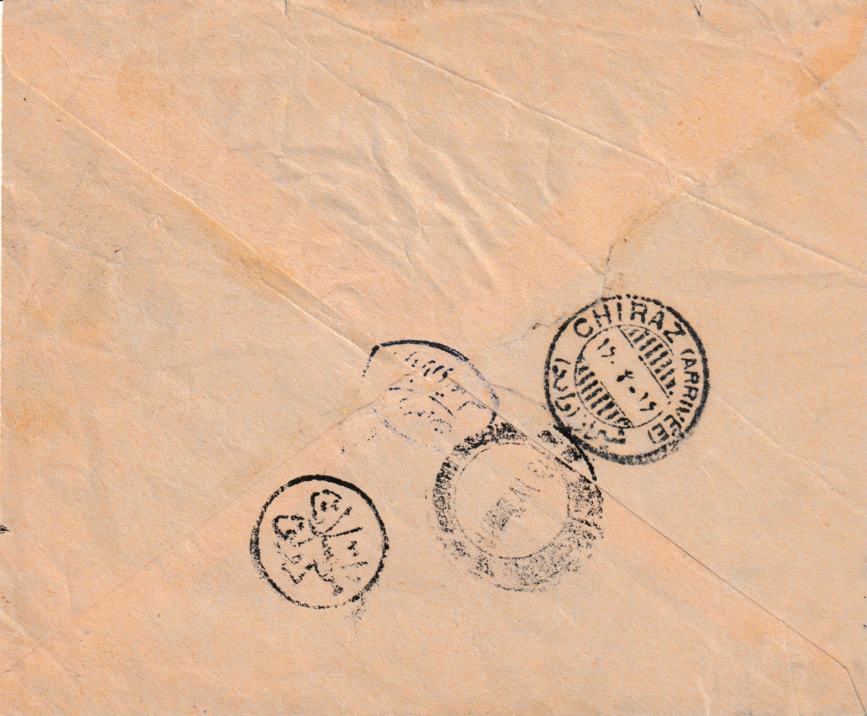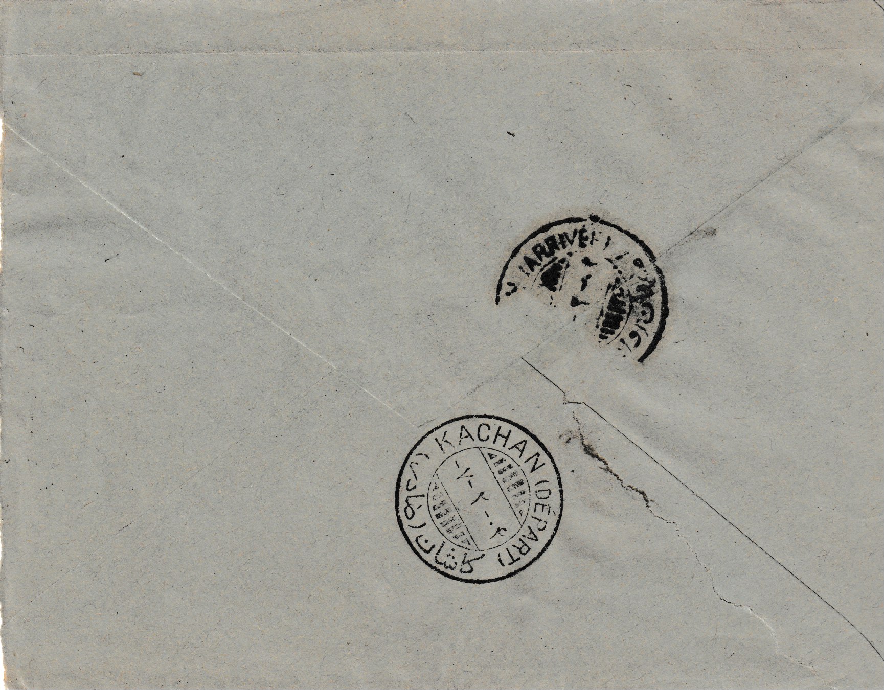 Privater Inlandbrief von Kazvin über Teheran nach Yezd. Auf der Rückseite Aufgabestempel Kazvin 24.XII.22, Ankunftsstempel Yezd 16.I.23
