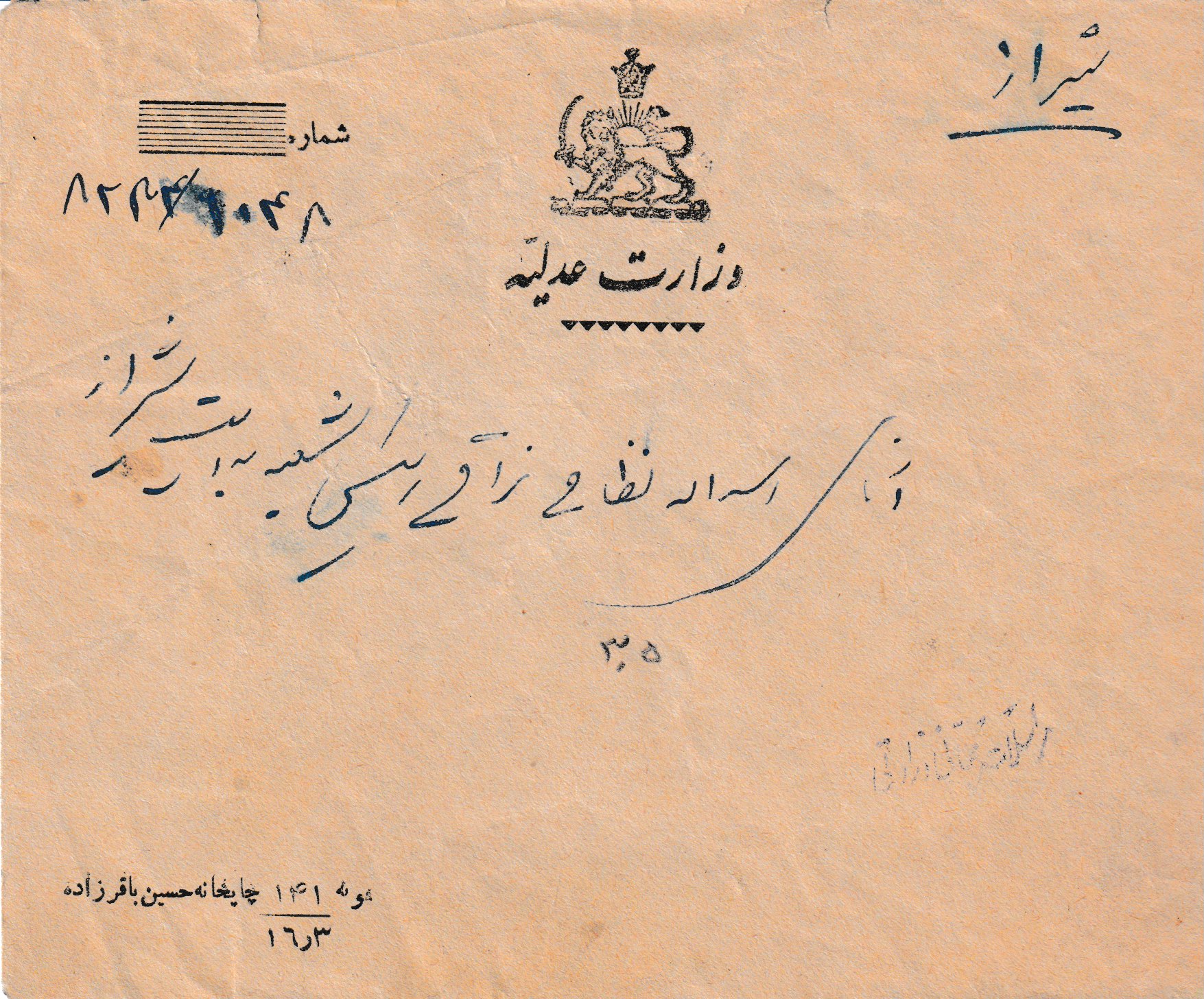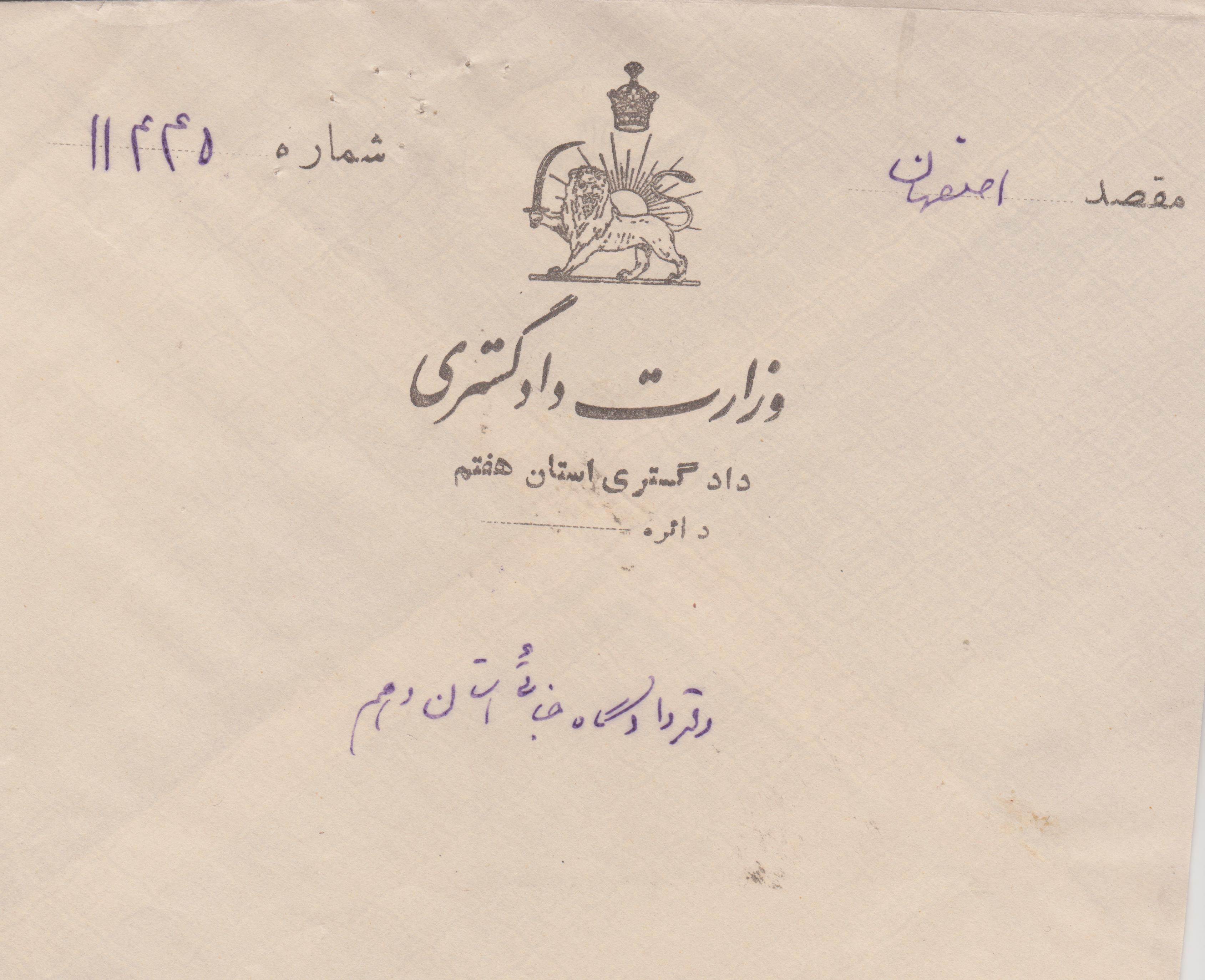 | Verwaltungsbrief Teheraner Justizministerium nach Chiraz, Ankunftsstempel 16.3.1316 = ( 5.6.1937 )