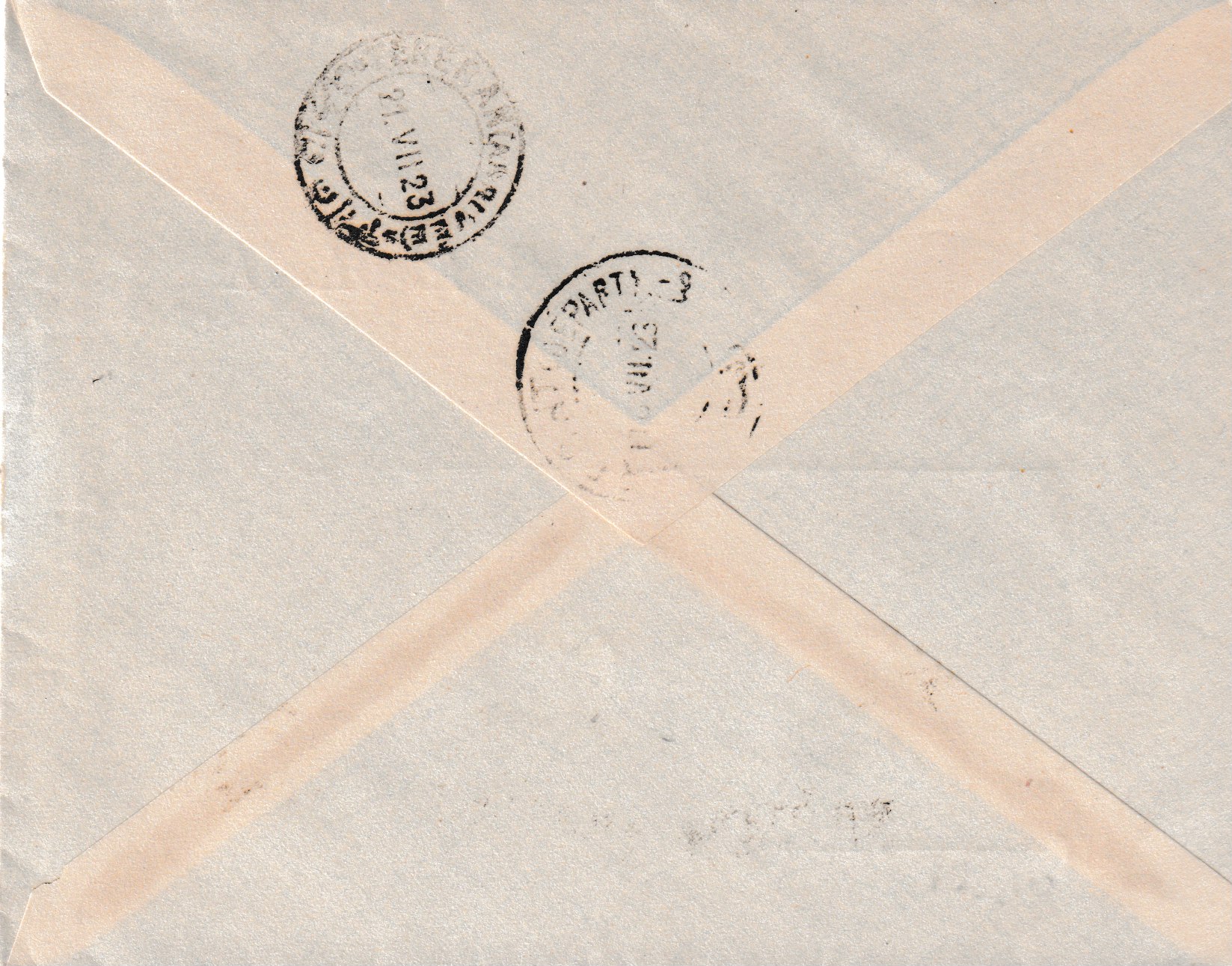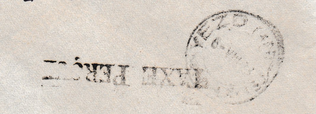 Mangel an Briefmarken : der Stempel besagt, dass Gebühr am Schalter bezahlt worden ist.