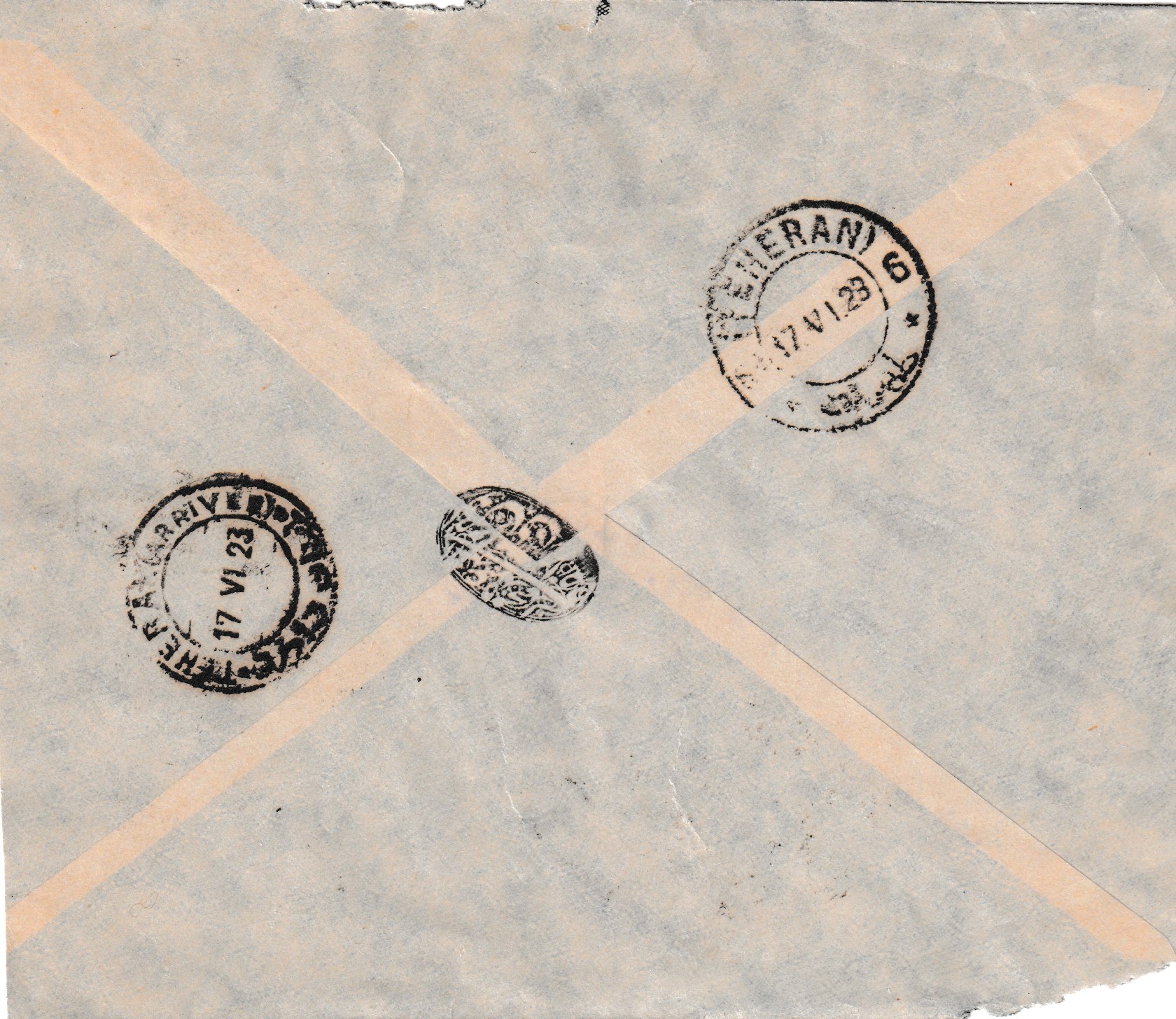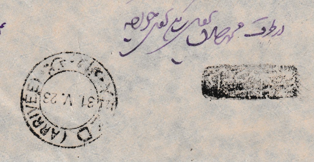 Aufgabeort des Briefes ist unbekannt, über Teheran nach Yezd, Ankunftsstempel Yezd 31.V.23