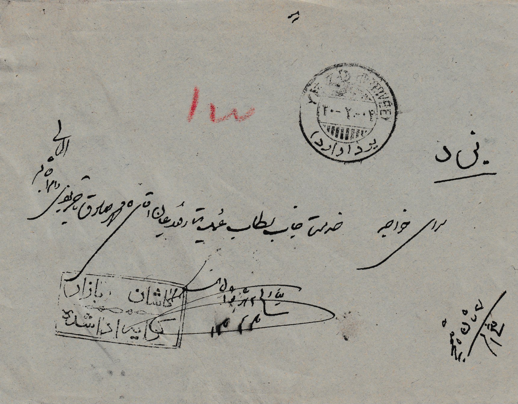 Aufgegeben am 7.2.1304 = (27.4.1925) in Kachan über Isfahan, Ankunftsstempel Yezd am 30.02.1304 = (20.05.1925)