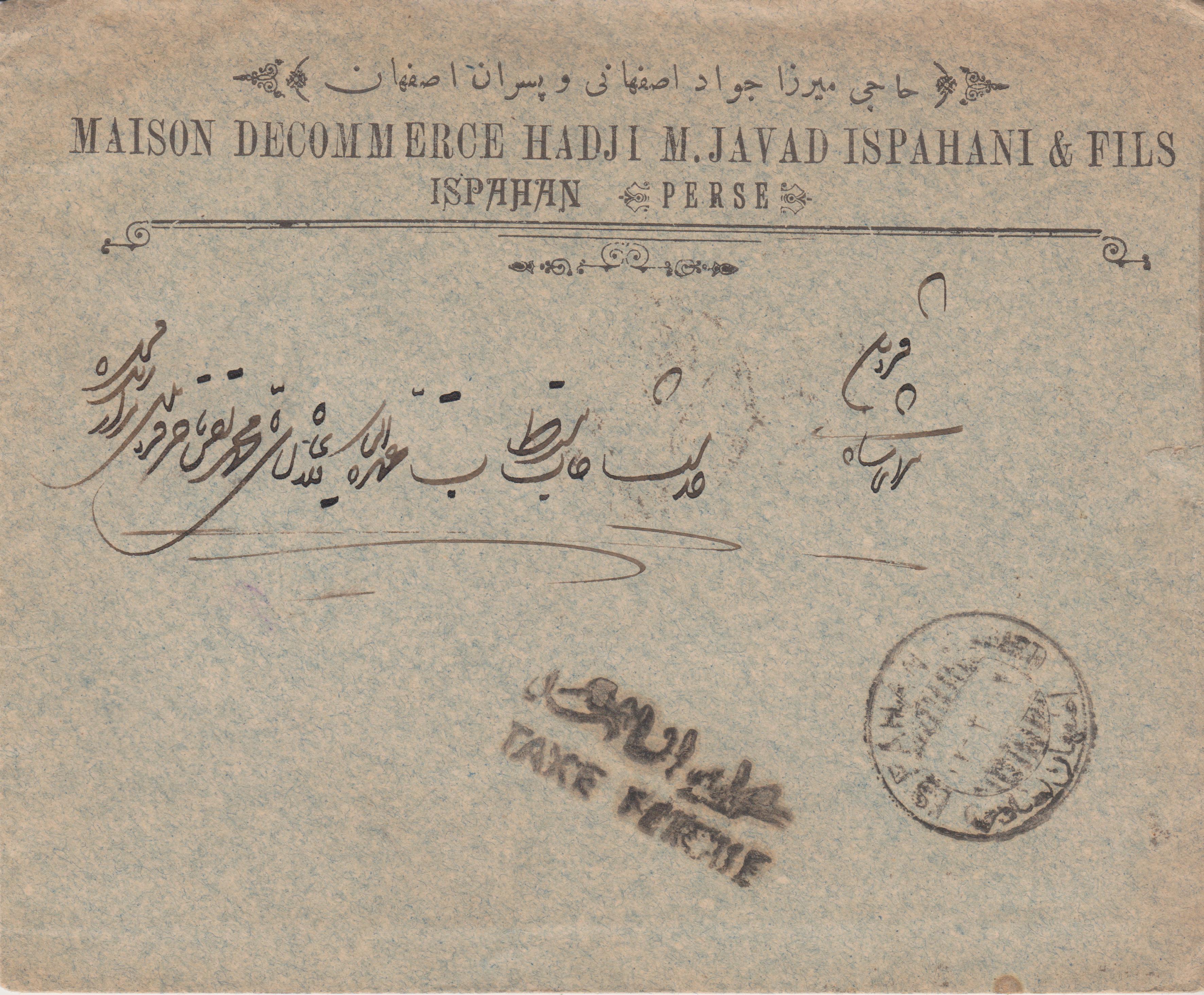 M. JAVAD ISPAHANI Privater Inlandbrief von Ispahan über Teheran nach Kazvin. Aufgabestempel Ispahan 17.3.?