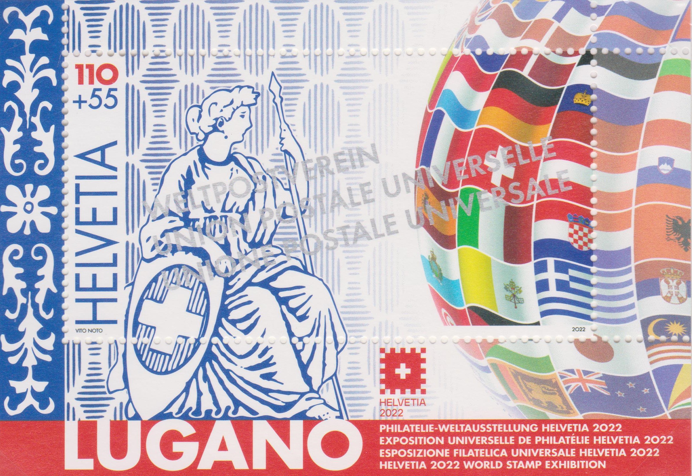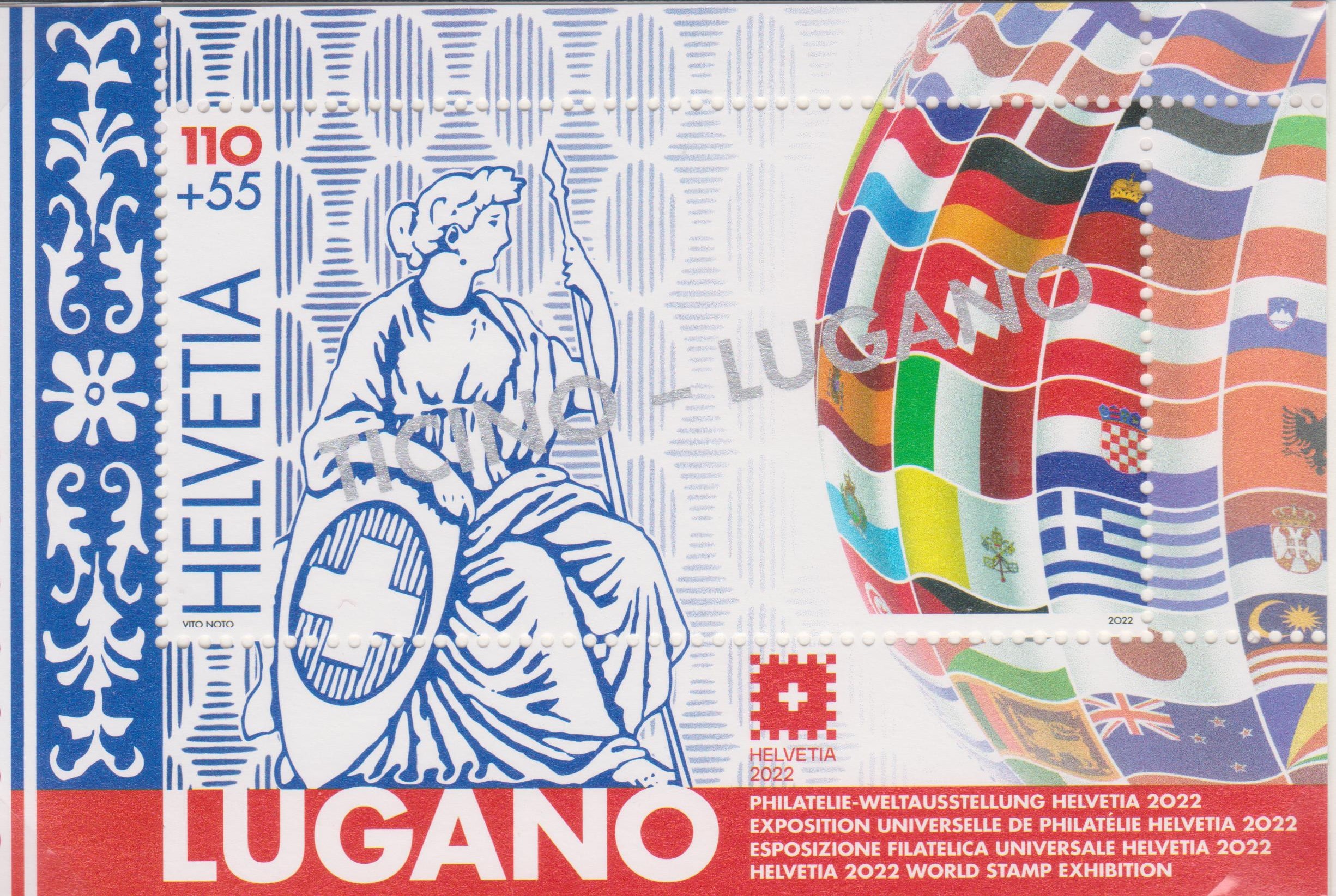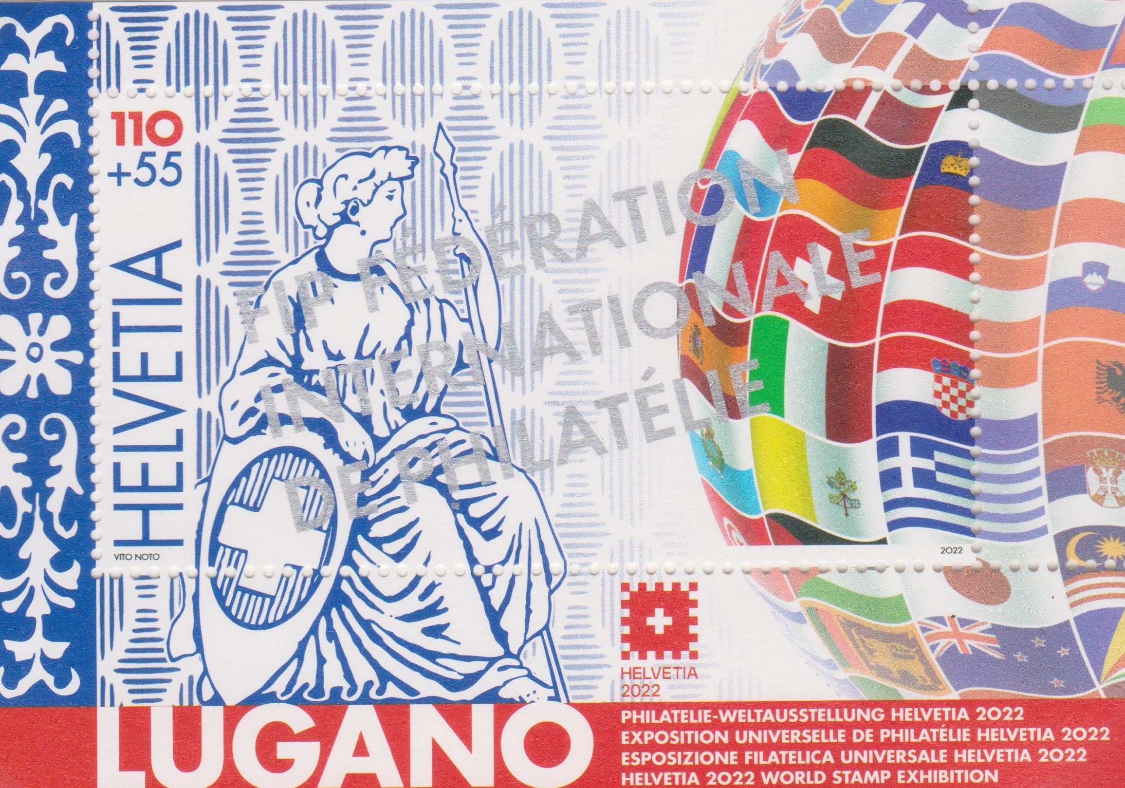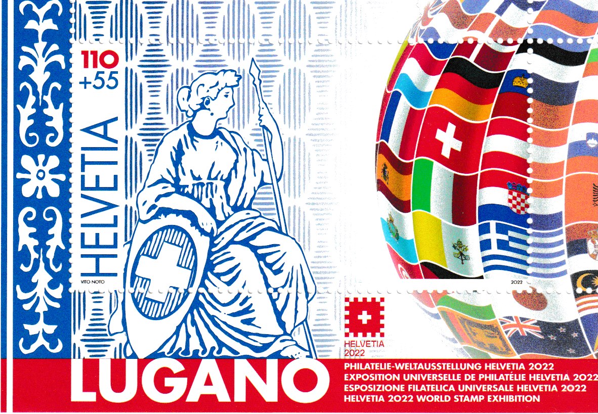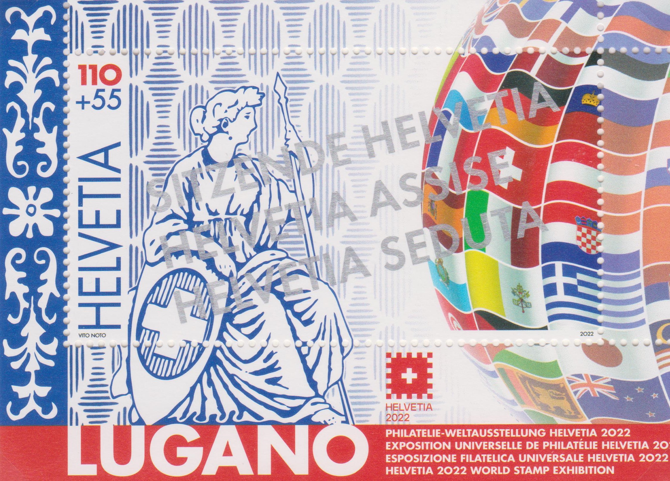 Nach fast 50 Jahren fand in der Schweiz vom 18. - 22. Mai 2022 die Weltausstellung in Lugano statt. Die letzte Ausstellung, die INTERNABA, wurde 1974 in Basel abgehalten. Der lange Zeitraum seit der letzten Weltausstellung in Basel war nicht der einzige Grund : im Jahr 1862 wurde die Briefmarke "Sitzende Helvetia" herausgegeben - also vor nicht weniger als 160 Jahren. Die Schweizerische Post war 2022 aus diesem Anlass mit einem Stand in Lugano vertreten und verausgabte an jedem Ausstellungstag einen Block mit einem anderen silbrigen Aufdruck, natürlich in einer limitierten Auflage.