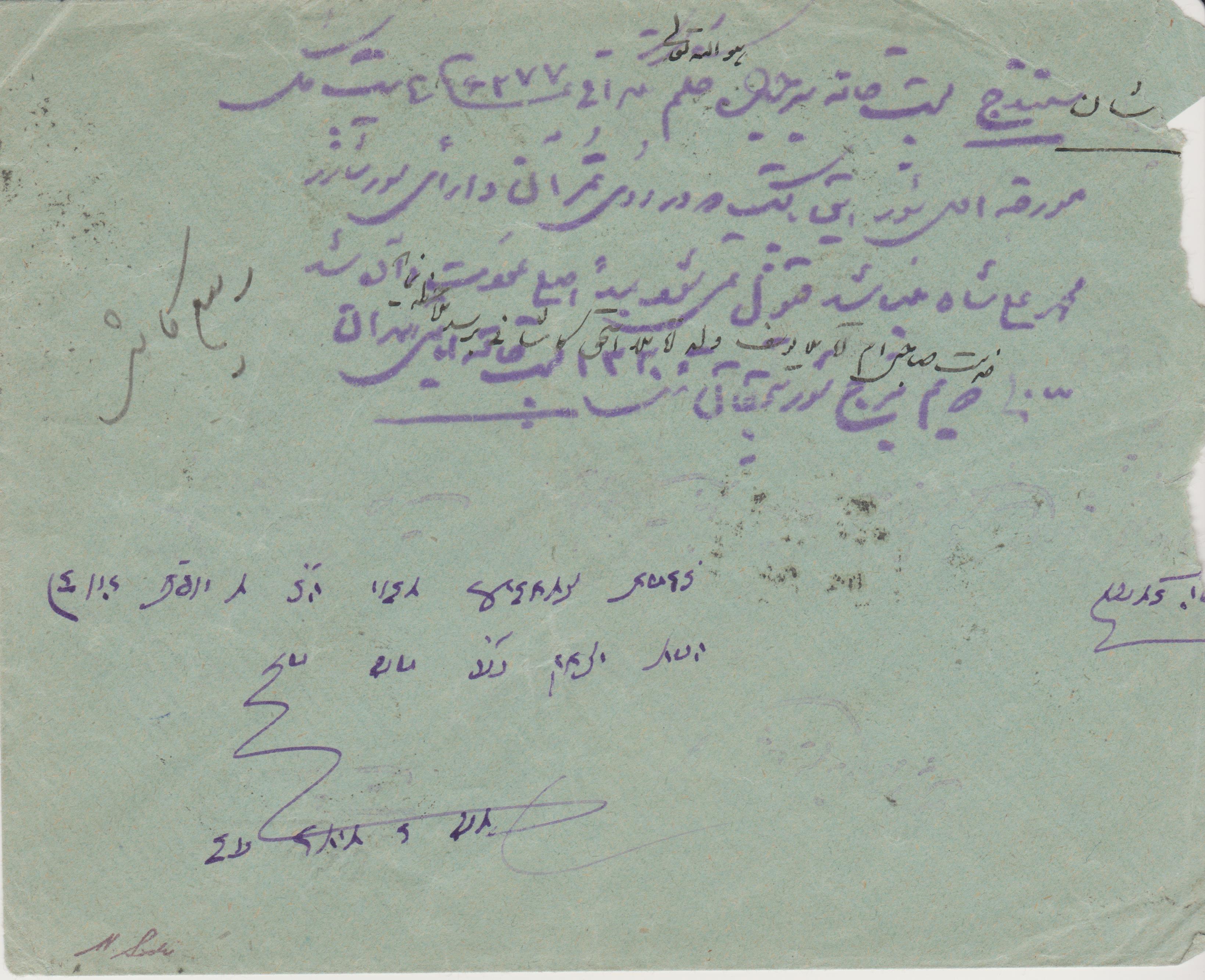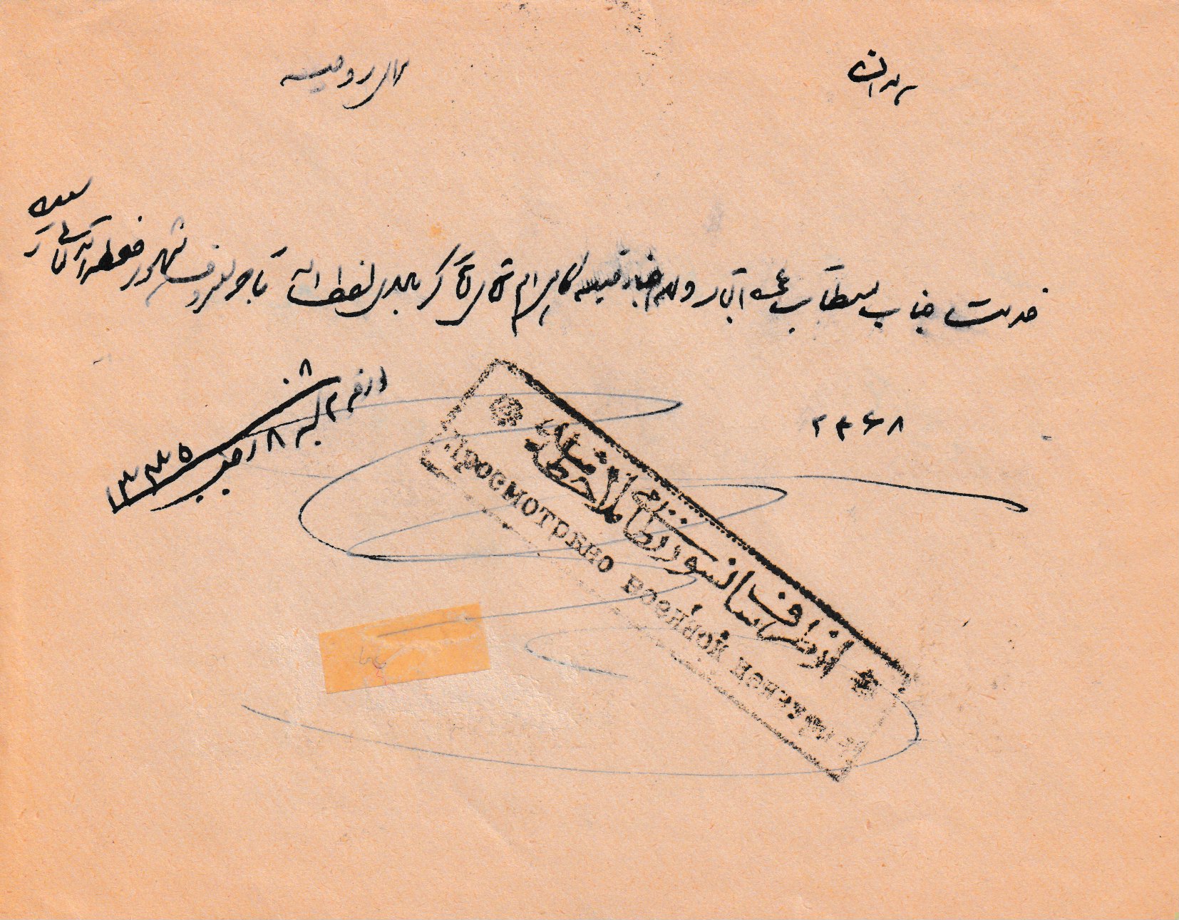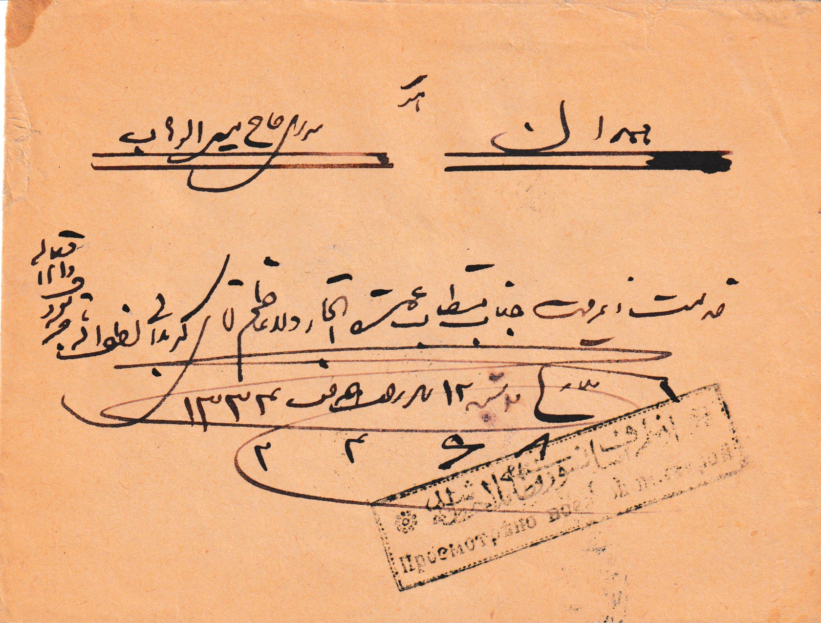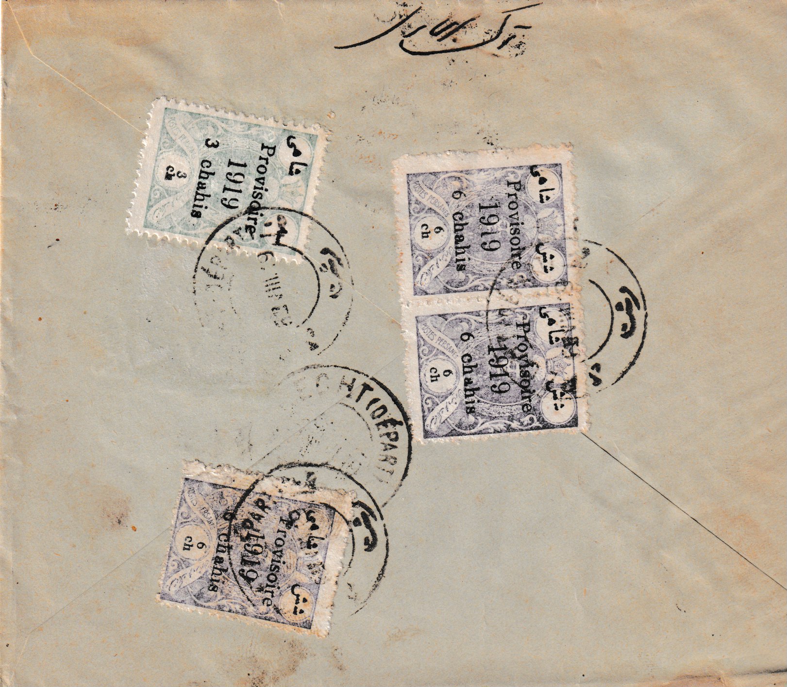 Gemäß Telegrafischer Anordnung Nr. 6277 des Ministeriums für Post,Telegraph und Telefon an das Postamt Senneh mussten alle Belege mit dem Aufdruck in Farsi » Mohammad Ali Schah Qadjar « zurückgeschickt werden.
