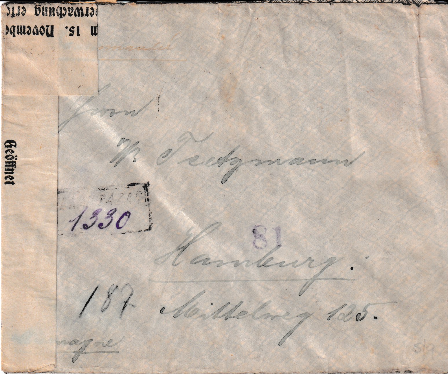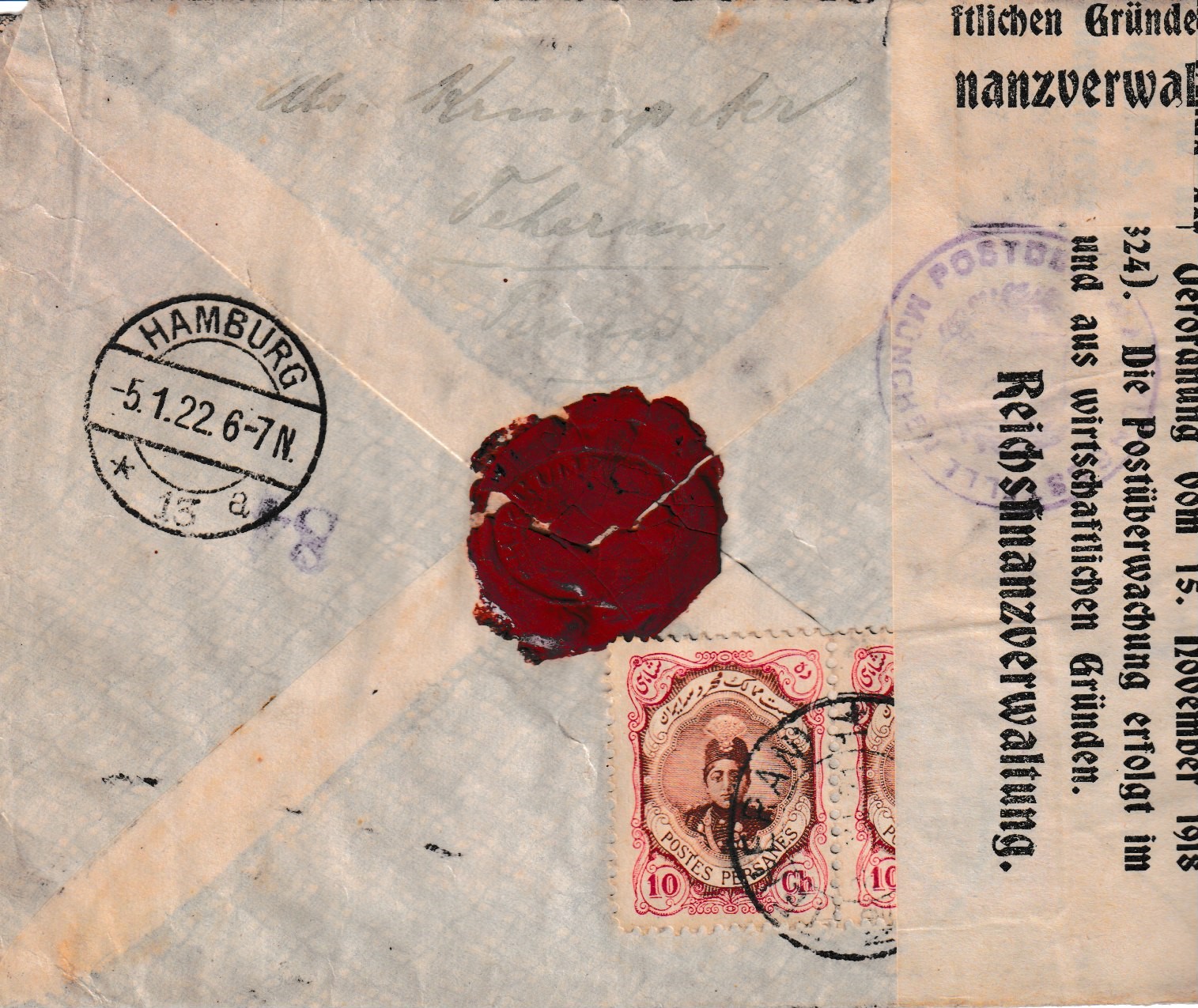 Auslandsbrief von Teheran nach Hamburg, Ankunftsstempel 5.1.22