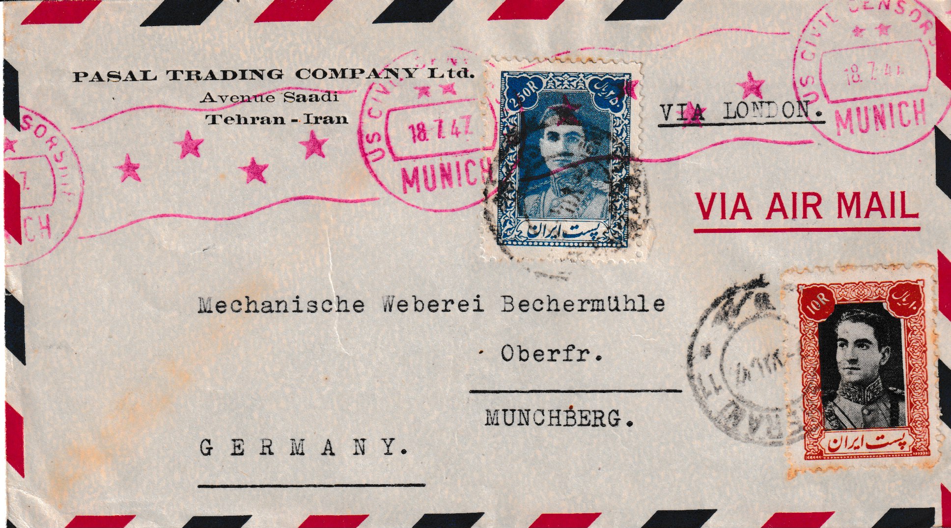 | Auslandbrief von Teheran nach Münchberg, Aufgabestempel 18.7.47