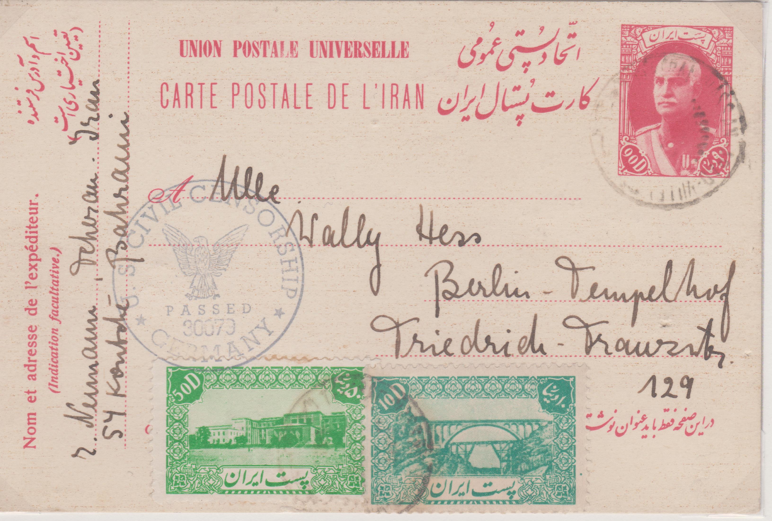 Auslandspostkarte von Teheran nach Berlin - Tempelhof geschrieben am 1.7.1940, Datum der Poststempel nicht lesbar